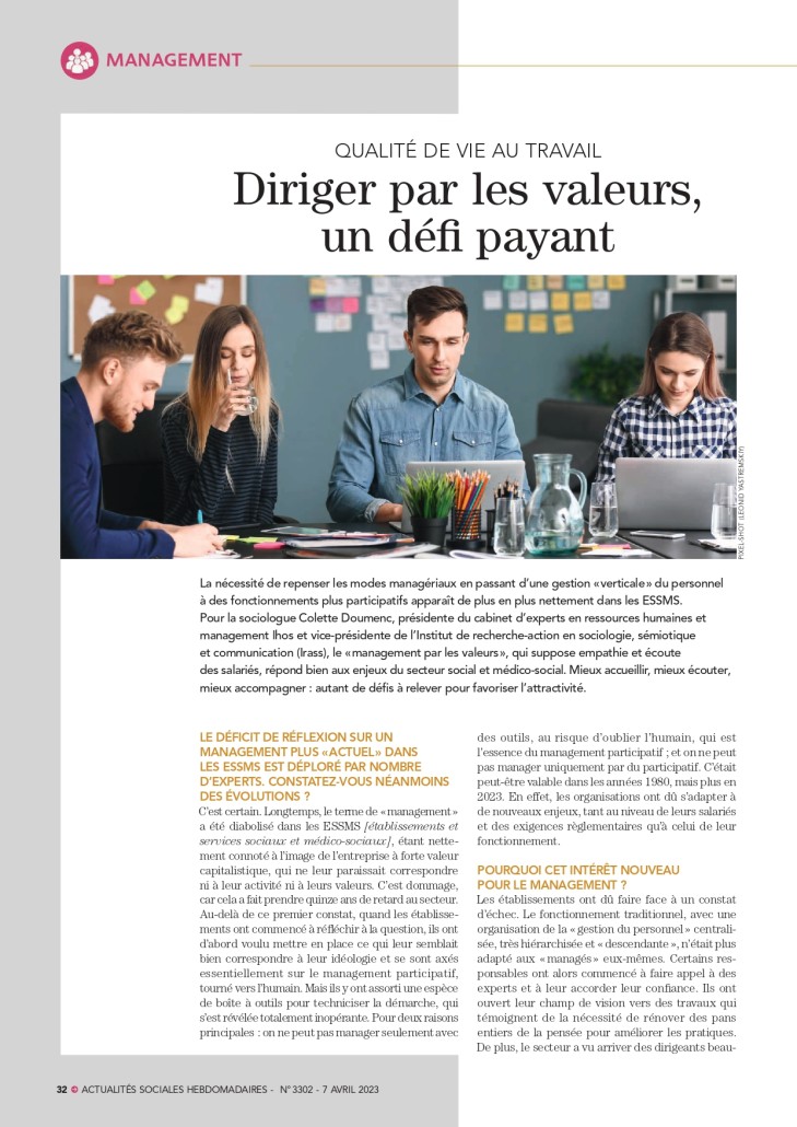 Management par les valeurs – Interview ASH N°3302 – 7 AVRIL 2023
